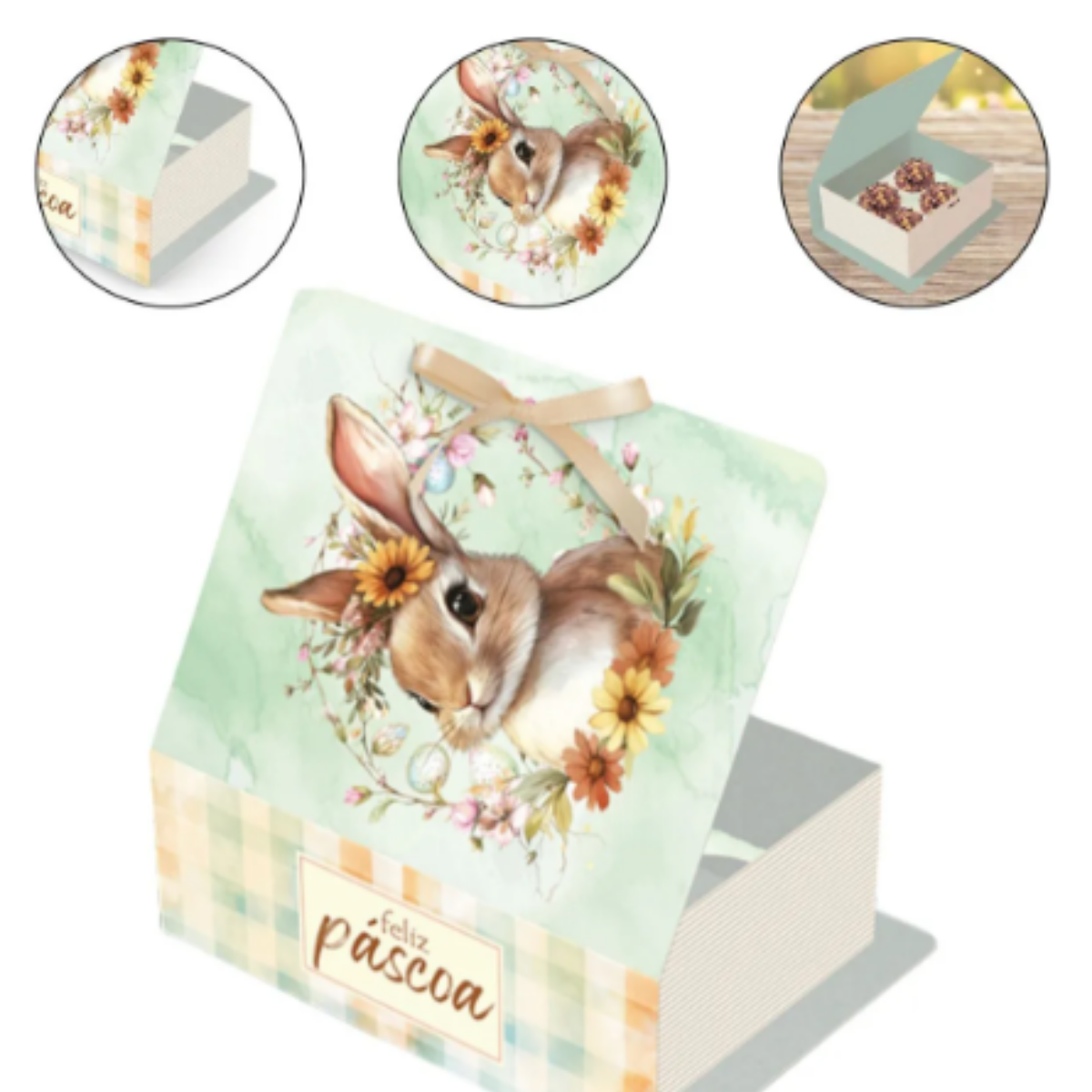 A Caixa 4 Doces Livro da linha Páscoa Encantos oferece charme e sofisticação. Com formato de livro e acabamento elegante, é ideal para presentes e doces artesanais. Ideal para trufas, brigadeiros, bombons e outras delícias, é a escolha certa para quem busca uma embalagem interativa, resistente e cheia de personalidade para esta Páscoa.