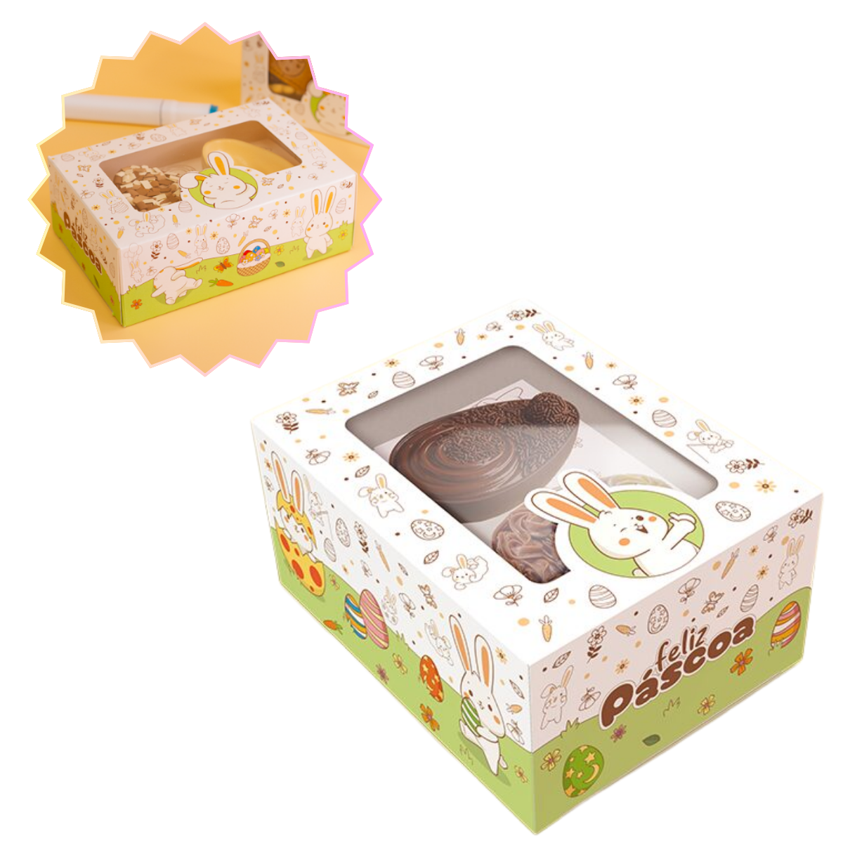 A Caixa Gaveta para Ovo de Colher (100/150g ou 2x50/80g) da linha Páscoa Colorir é interativa e encantadora. Com ilustração exclusiva para pintar e visor transparente, combina diversão e praticidade. O produto acompanha um berço versátil, que permite escolher entre duas opções de montagem: acomodar um ovo de colher de 100 a 150g ou dois mini ovos de 50 a 80g. Basta escolher a forma que melhor combina com sua produção.