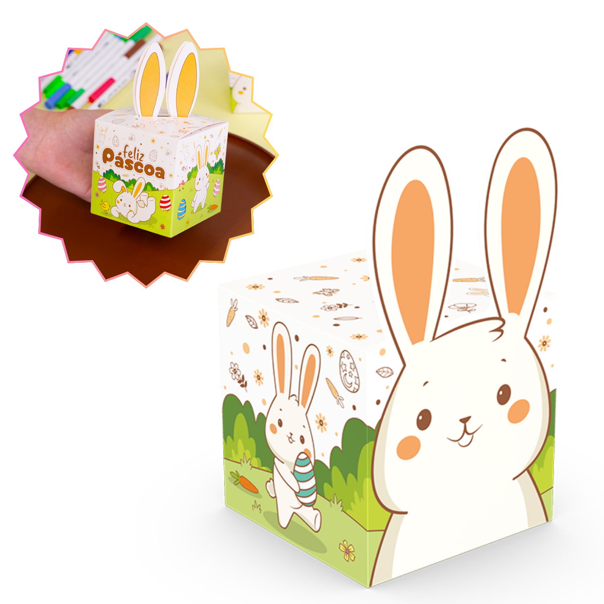 A Caixa Orelha da linha Páscoa Colorir é divertida e interativa. Ideal para Kit de colorir com doces e lápis de cor.