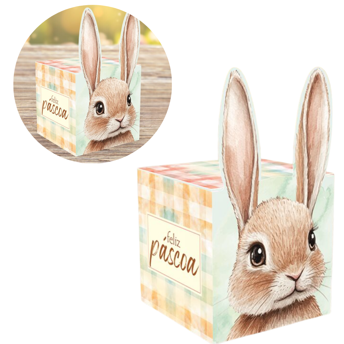A Caixa Pop Up Orelhas da linha Páscoa Encantos é divertida e charmosa. Com formato pop up e orelhas de coelho, é perfeita para lembranças criativas e doces de Páscoa.