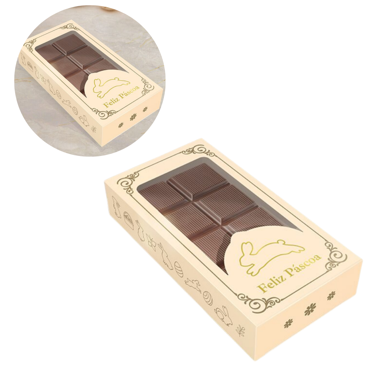 A Caixa Tablete G da linha Páscoa Luz combina sofisticação e funcionalidade. Com acabamento em hot stamping ouro e visor transparente, oferece uma apresentação refinada que valoriza tabletes de até 300g. Compatível com tabletes produzidos na forma BWB 9664, oferecendo encaixe ideal e acabamento profissional.