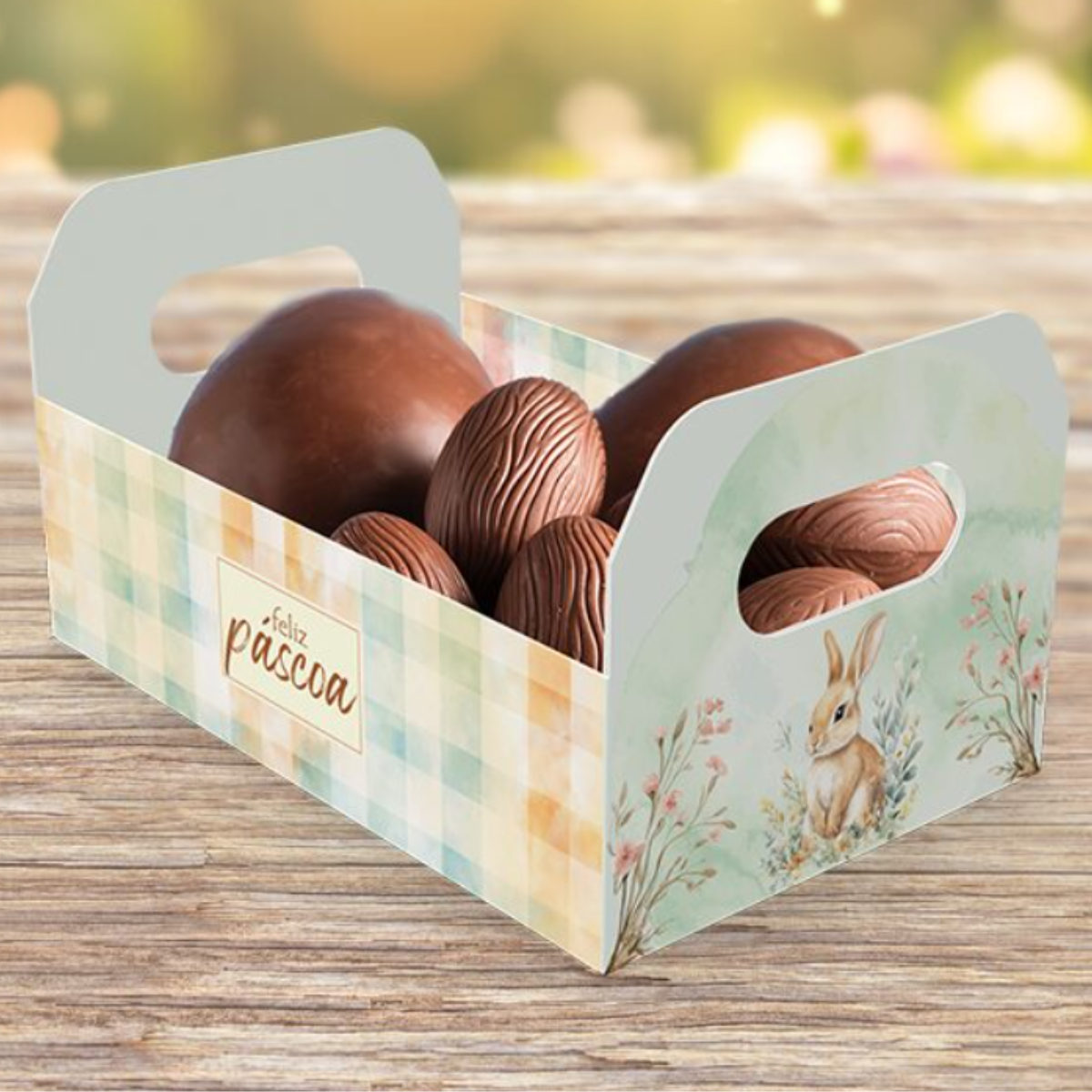 A Cesta Caixote M da linha Páscoa Encantos é prática e elegante, ideal para montar kits e presentes personalizados. Com estrutura firme e design moderno, valoriza qualquer composição artesanal.