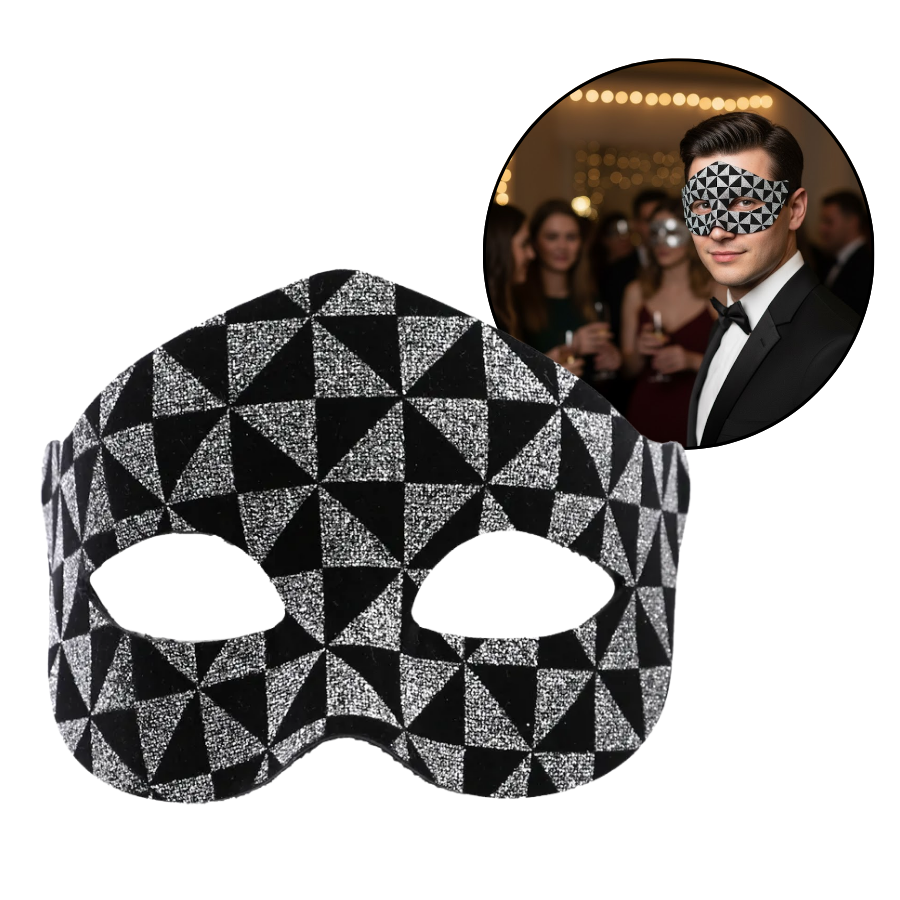 A máscara apresenta um design elegante e moderno, composto por um padrão geométrico de triângulos em preto e prata brilhante que cria um efeito visual marcante. O contraste entre as cores confere um ar sofisticado, enquanto o brilho suave adiciona um toque festivo. Com um formato clássico que contorna delicadamente os olhos, ela transmite mistério e estilo, sendo perfeita para bailes de máscaras, festas temáticas ou eventos que pedem um acessório ousado e artístico.