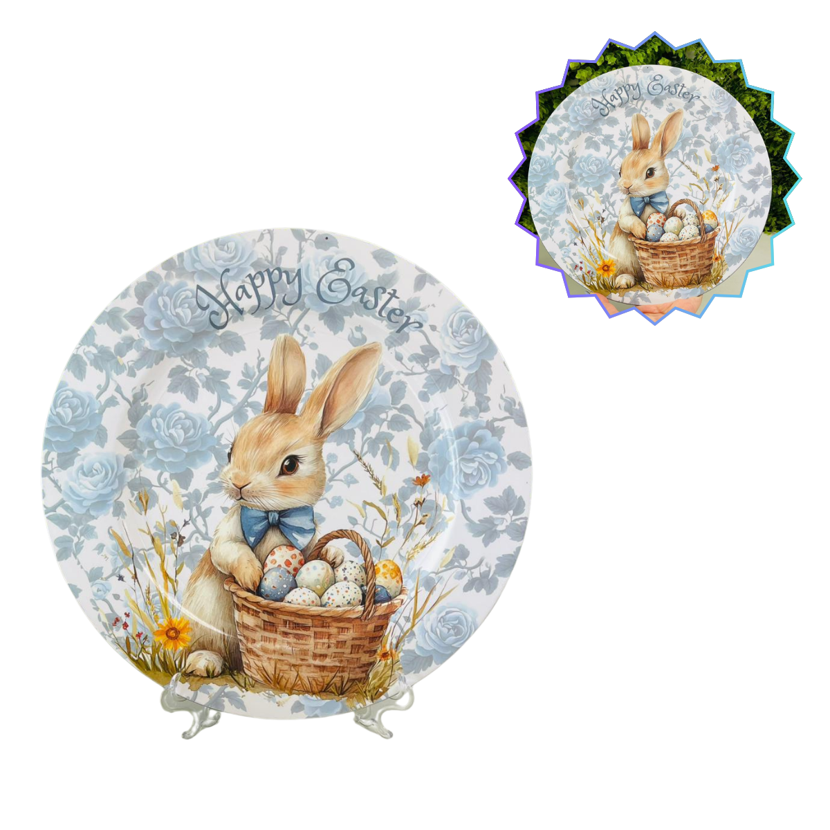 Transforme sua celebração com a elegância e o encanto do nosso prato decorativo temático. Com ilustrações delicadas em estilo aquarela e mensagens de "Feliz Páscoa", esta peça é o elemento que faltava para elevar o nível da sua decoração.
