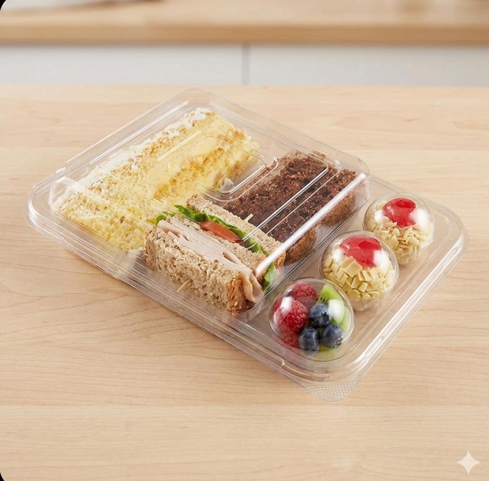 Versátil, pois permite inúmeras possibilidades, use sua criatividade! As cavidades podem ser utilizadas para fatia de bolo, mini pizza, lanche natural, salgadinho, guloseimas etc. Já as cavidades menores podem ser utilizadas para docinhos, molhos, caldas, cremes etc. Esta embalagem é perfeita para lembrancinhas, kit festa, festa na escola, piqueniques, delivery e etc