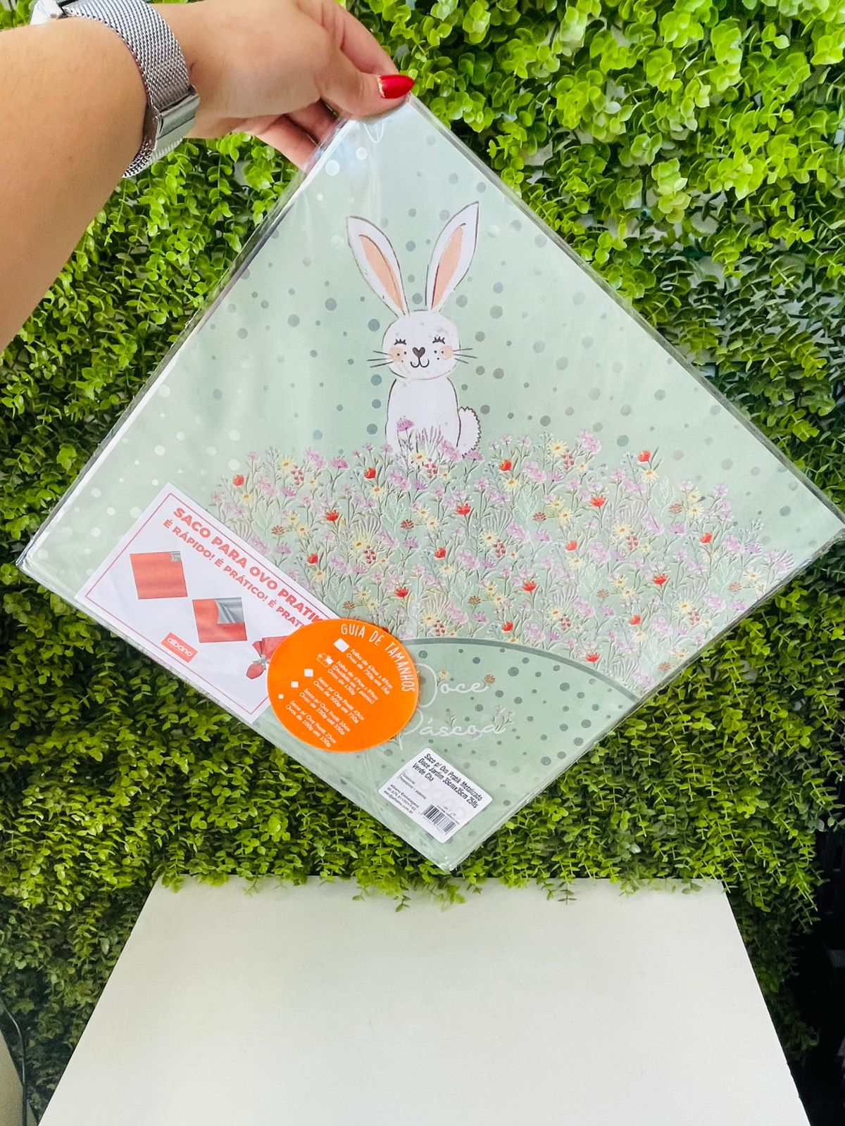 O saco Doce Jardim - Verde Chá para ovos é uma opção que valoriza ainda mais seus produtos, deixando suas encomendas muito mais sofisticadas! Com uma estampa encantadora, ele torna o processo de embalar ovos de Páscoa muito mais prático.