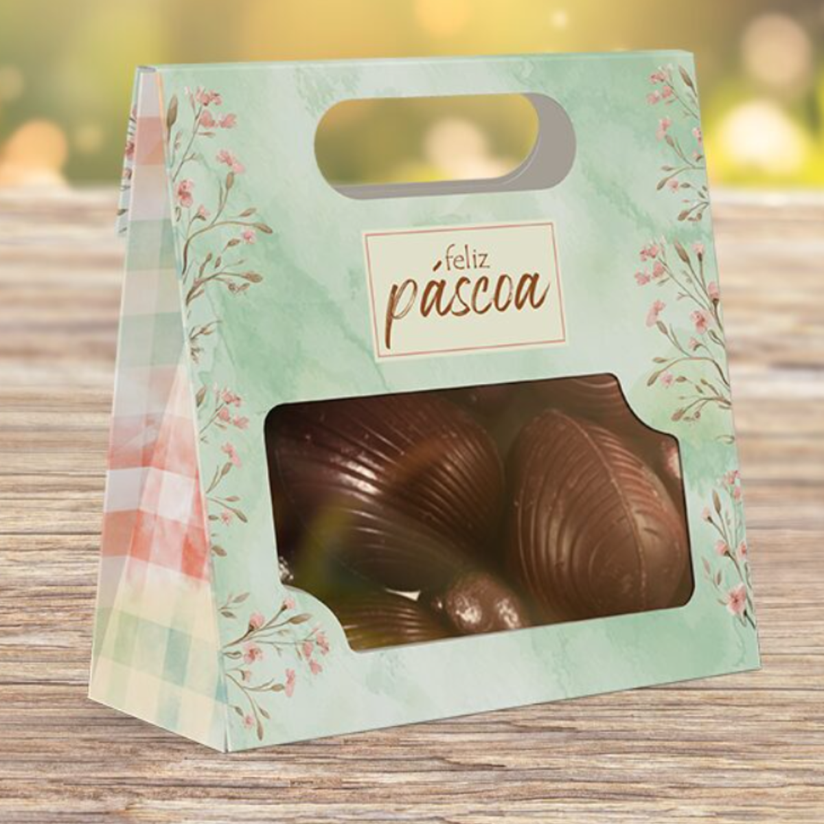 O Saco Practice com Alça e Visor da linha Páscoa Encantos une elegância e praticidade. Com visor frontal e alça para transporte, é ideal para presentes e doces artesanais.
