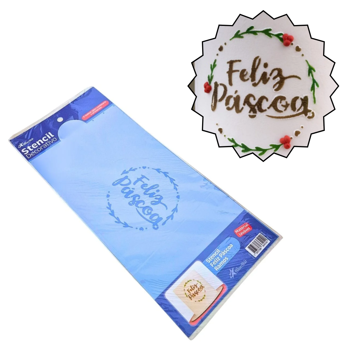 O Stencil Feliz Páscoa Ramos da Blue Star pode ser usado em diversas decorações. Tamanho especial para bolos. Prepare-se para fazer lindas decorações com diferentes possibilidades! Material lavável e com furinhos para fixar no bolo. Use também para trabalhos artesanais em outros materiais como em biscuit, madeira e tecidos.